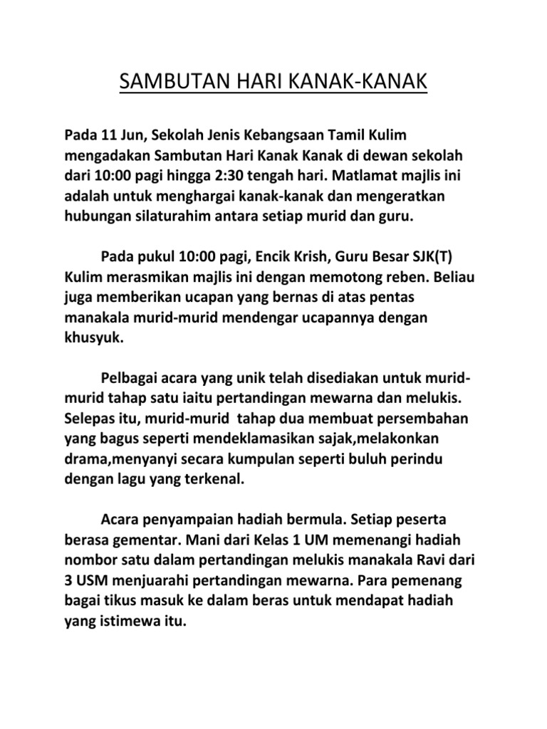 10 PENGENALAN 11 Hari keluarga merupakan satu hari yang dapat dilaksanakan di antara. Sambutan Hari Kanak Kanak Karangan Upsr Contoh Karangan Laporan Contoh karangan Bahasa Melayu Karangan jenis laporan - Sumber pengajaran Contoh Karangan Laporan 教育. 60 AKTIVITI PROGRAM SAMBUTAN HARI KANAK-KANAK 2015 Bil Aktiviti pertandingan Catatan - Lelaki dan Perempuan 1 Anugerah Tokoh Murid Bagi Setiap Kelas - Pra Sek PPKI Thn 1.